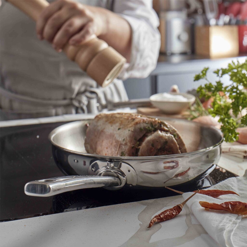 Cette poêle a un fond à 5 couches. Les poêles à 5 couches font passer le processus de cuisson au niveau supérieur avec cinq couches d'aluminium et d'acier inoxydable. Ces couches supplémentaires assurent une répartition et une rétention de chaleur encore meilleures, vous donnant ainsi plus de contrôle sur la température. Idéal pour les techniques de cuisson délicates, où la précision fait la différence. Le poids de la poêle vous offre un peu plus de stabilité pendant la cuisson.