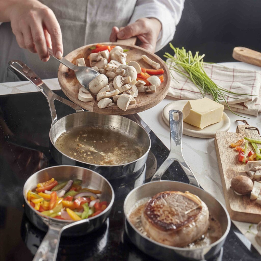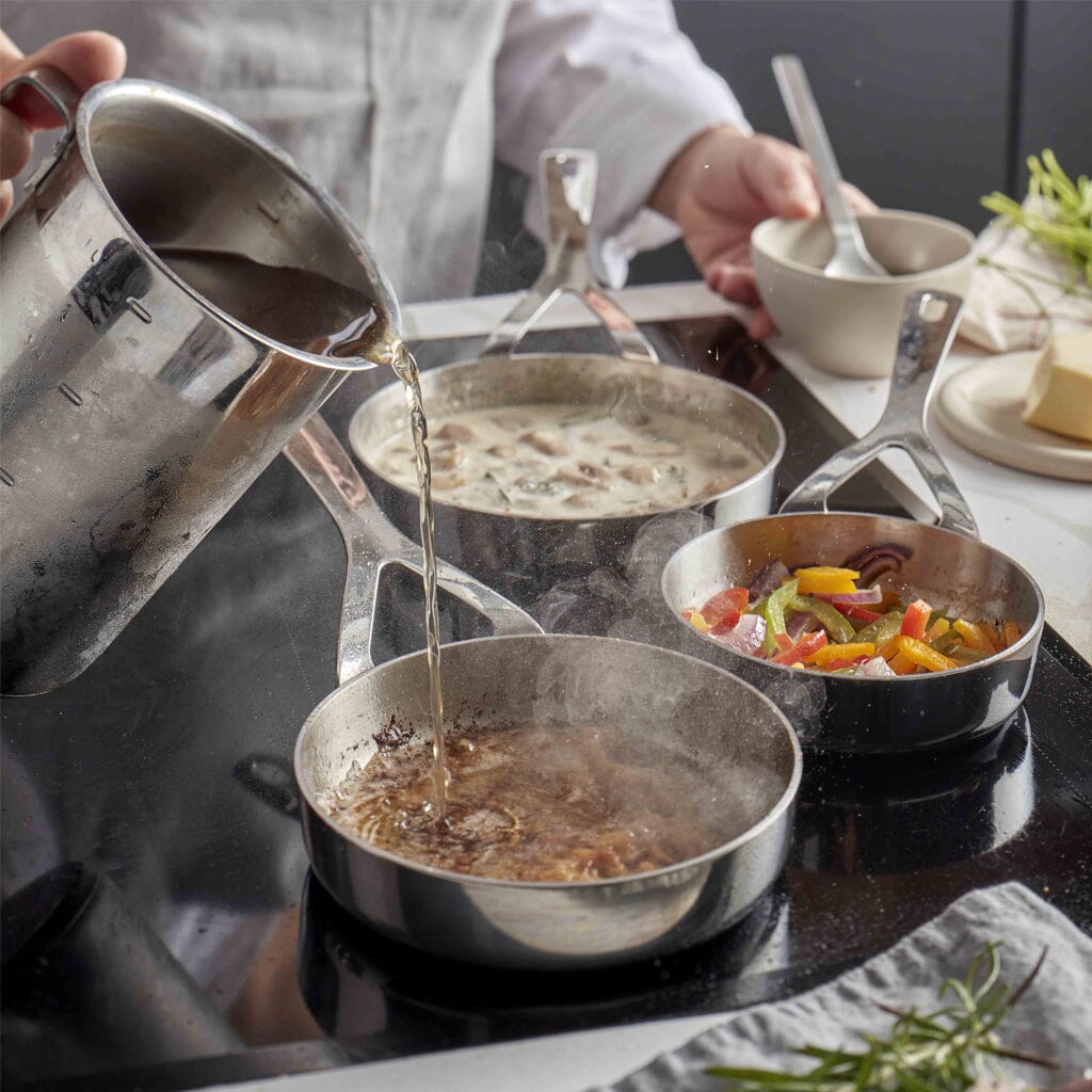 Cette poêle a un fond à 3 couches. Les poêles à 3 couches ont un noyau en aluminium entre deux couches d'acier inoxydable. Cette conception offre une excellente conduction thermique, tandis que l'extérieur en acier inoxydable protège votre poêle de la corrosion et garantit que le matériau ne réagit pas avec les aliments. Le résultat ? Durabilité et préparation homogène de vos plats, à chaque fois.