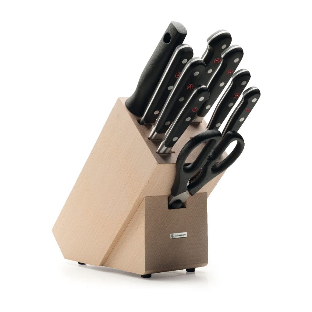Qualité, style et intégralité réunis. Le coffret de 9 couteaux WÜSTHOF Classic avec bloc à couteaux est idéal pour tous ceux qui recherchent des bases solides en cuisine, tout en laissant libre cours à leurs talents culinaires. Que vous soyez un cuisinier amateur en herbe ou un chef amateur expérimenté, ce coffret vous offre le couteau idéal pour chaque tâche de découpe.