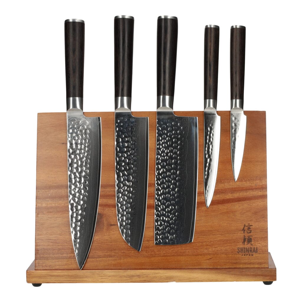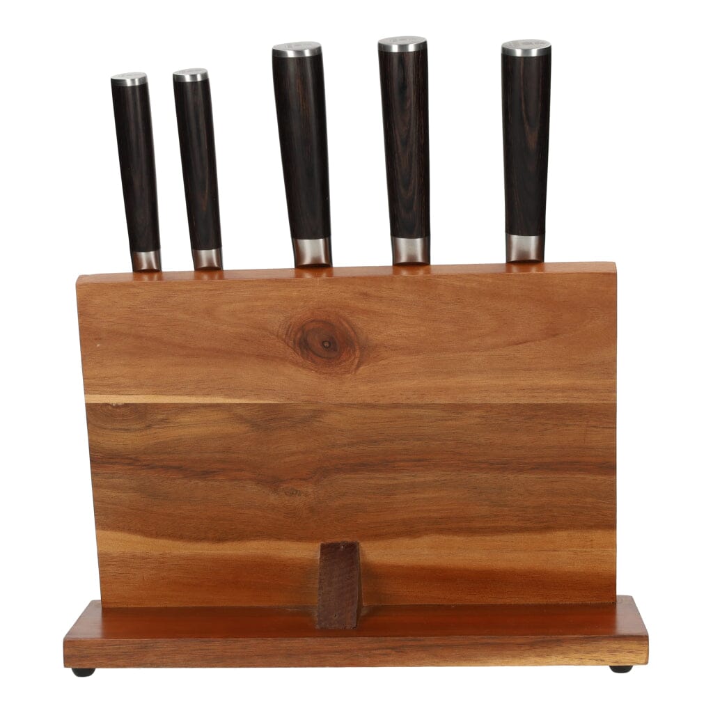 Ce bloc à couteaux en bois d'acacia est livré avec 5 couteaux de la série Hammered Damast BR qui conviennent à diverses tâches de coupe en cuisine. La combinaison de manches en bois de pakka et d'un bloc à couteaux en bois d'acacia fera vraiment ressortir les couteaux.