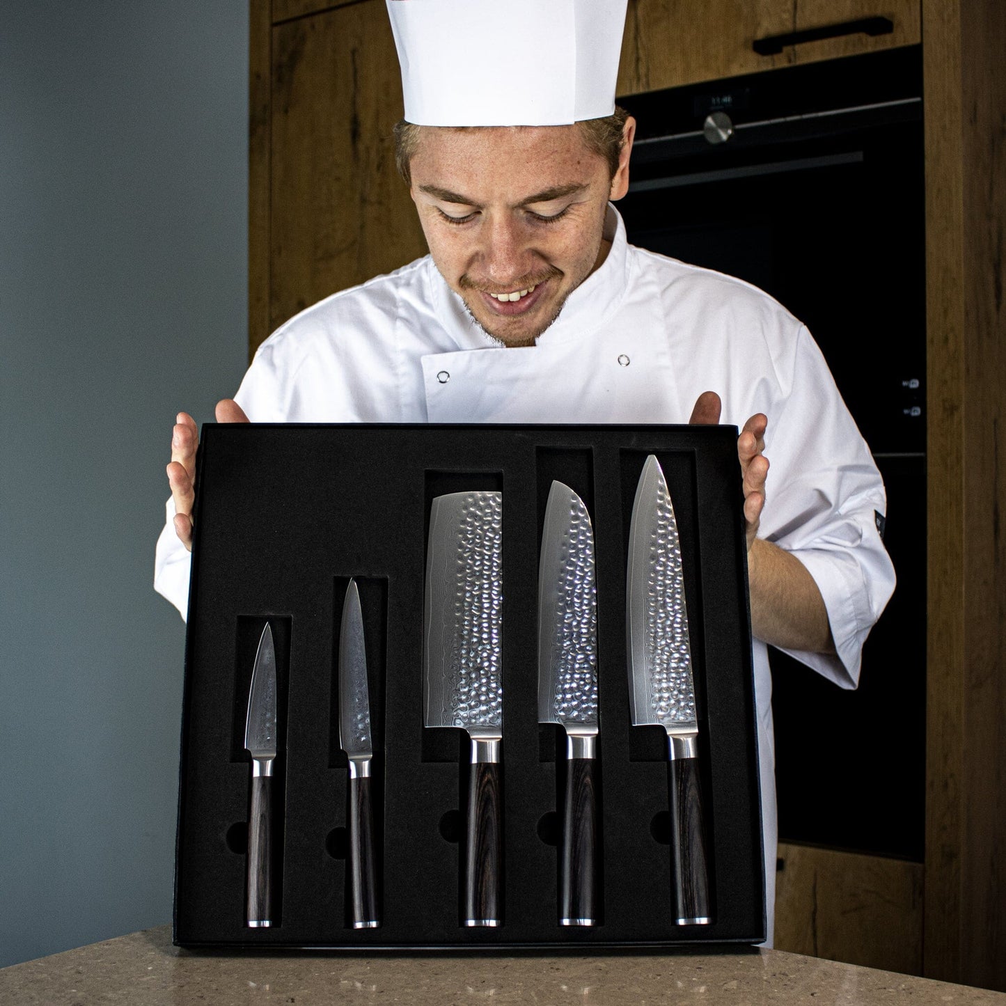 Les couteaux sont toujours livrés dans un joli coffret cadeau. Cela garantit non seulement que les couteaux sont protégés tout au long du processus, mais également que cela vous fait sourire lorsque vous les recevez.