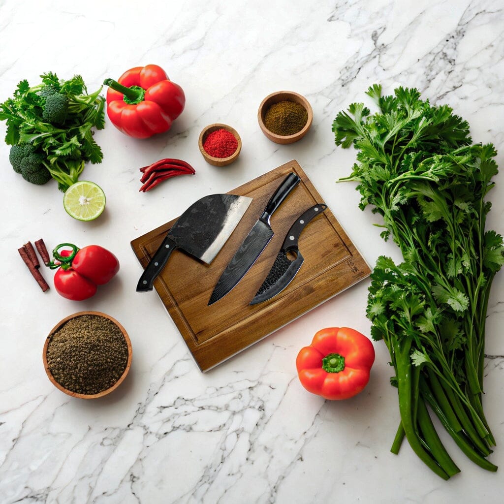A wonderful combination deal with handy and good-looking knives! This combination deal consists of the 15 cm Hammered Gladiator chef's knife with a beautiful leather holster, a 20 cm Hammered stainless steel chef's knife, a 20 cm Forged Butcher knife and a fine cutting board that can be used multifunctionally. This gives you the perfect trio of knives for the kitchen and a suitable cutting board for every job.