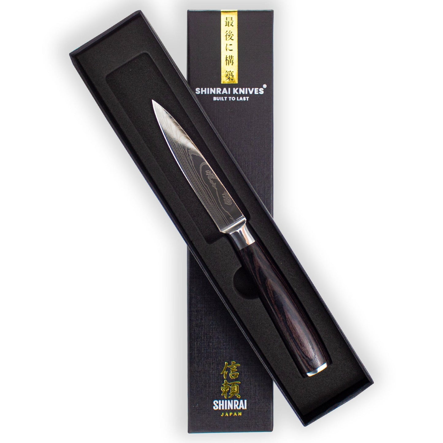 The Shinrai - Damascus Print Paring Knife 8 cm is beautiful and unique. People who cut a lot have probably suffered from it: knives that become blunt very quickly and blades where the cut food always sticks to the knife. With this razor-sharp knife from Shinrai that is a thing of the past. The handmade steel blade runs through a beautiful pakka wood handle. The knife from Shinrai is unique, because most of it is handmade. Forged from High Carbon steel, which makes the knife hard and very sharp. A beautiful and durable knife that cannot be missing in your kitchen.