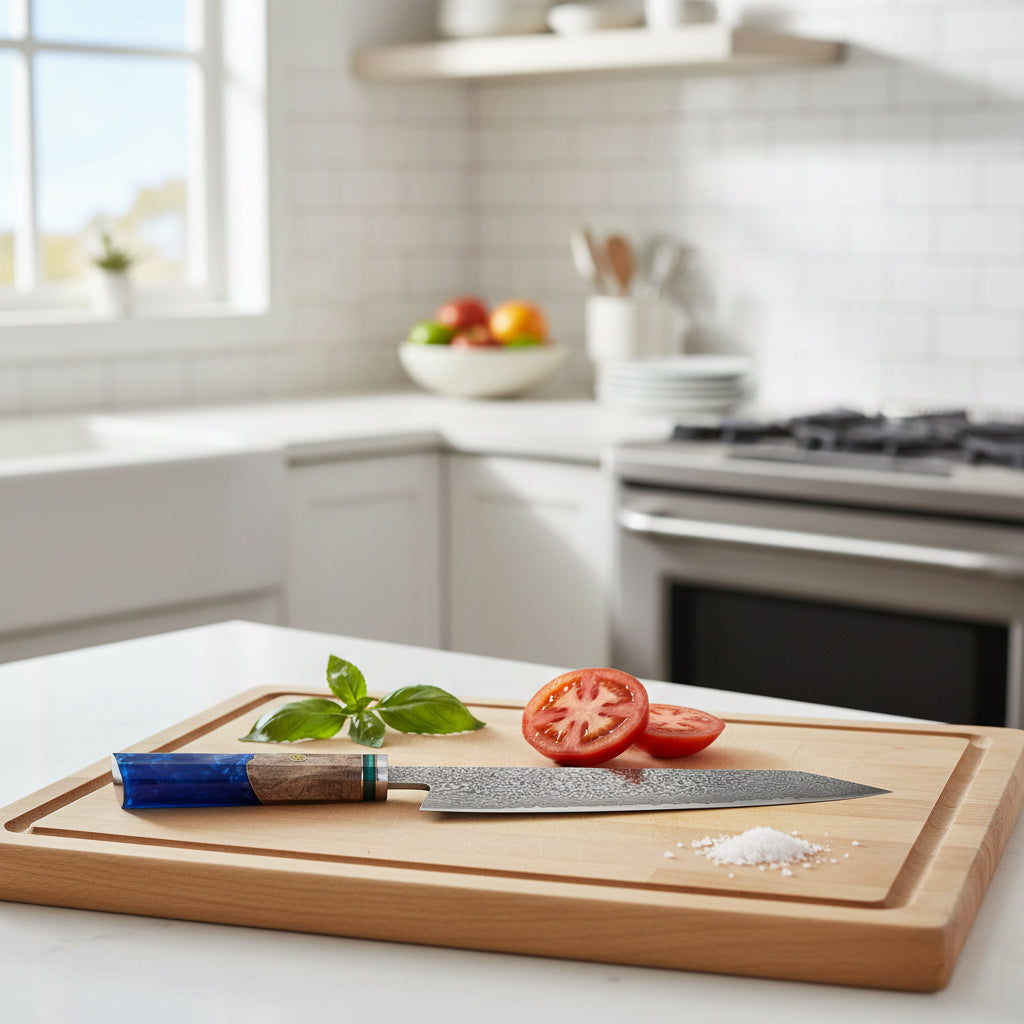 The Kiritsuke Octagons Series - Kiritsuke knife Damascus Sapphire Octagon from Shinrai Knives is designed as a versatile knife for preparing Asian dishes. This is done by combining the blade of a nakiri (vegetable knife) and sujihiki (fish knife). This combination ensures that you can cut many ingredients with one knife.