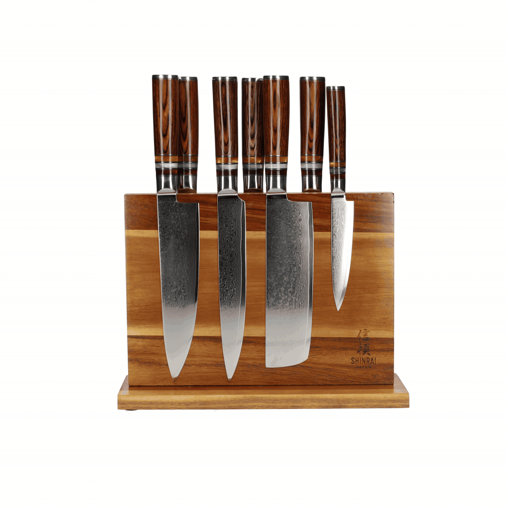 The Shinrai Micarta Jewels Series 7-piece knife set is the perfect addition to your kitchen. This unique set combines high-quality knives with an elegant double-sided magnetic acacia wood knife block, a stylish and practical way to safely store your knives.
