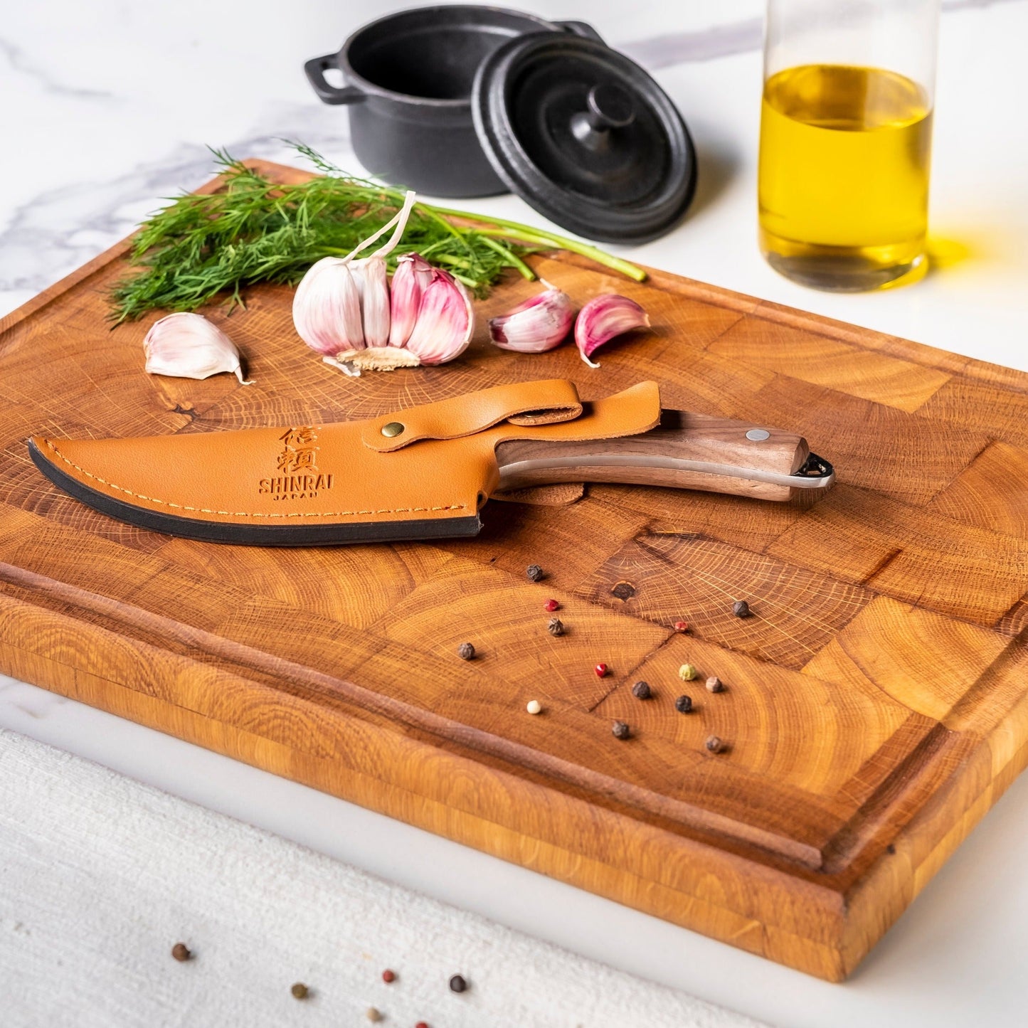 The Shinrai - Stainless Steel Gladiator Chef's Knife with Holster - Brown ensures effortless cutting and prevents ingredients from sticking. A must-have for every kitchen! Order now and take your cooking skills to the next level!